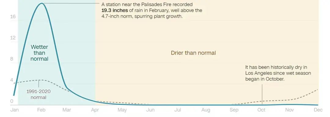本次山火最严重区域之一——帕里萨德附近气象站 2024 全年降水变化(实线曲线)和 1991-2020 年平均降水(虚线)。可以看见当地出现显著的从湿润向干旱的急剧转折