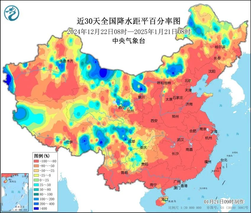 中央气象台1月21日公布的我国近30天降水距平百分率图,可以看出,我国今年冬季十分干旱。