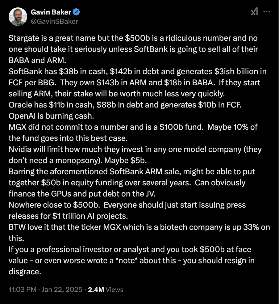 美国著名TMT投资人Gavin Baker认为,5000亿美元是一个“荒谬的数字”,除非软银选择抛售手上所有阿里巴巴和Arm的股票。据报道,1000亿美元的注资预计很大一部分将来自尚未确定身份的新投资者,可能由创始合伙人和共同投资者的股权以及债务组成。微软表示公司今年800亿美元的资本支出预算和“星际之门”无关。