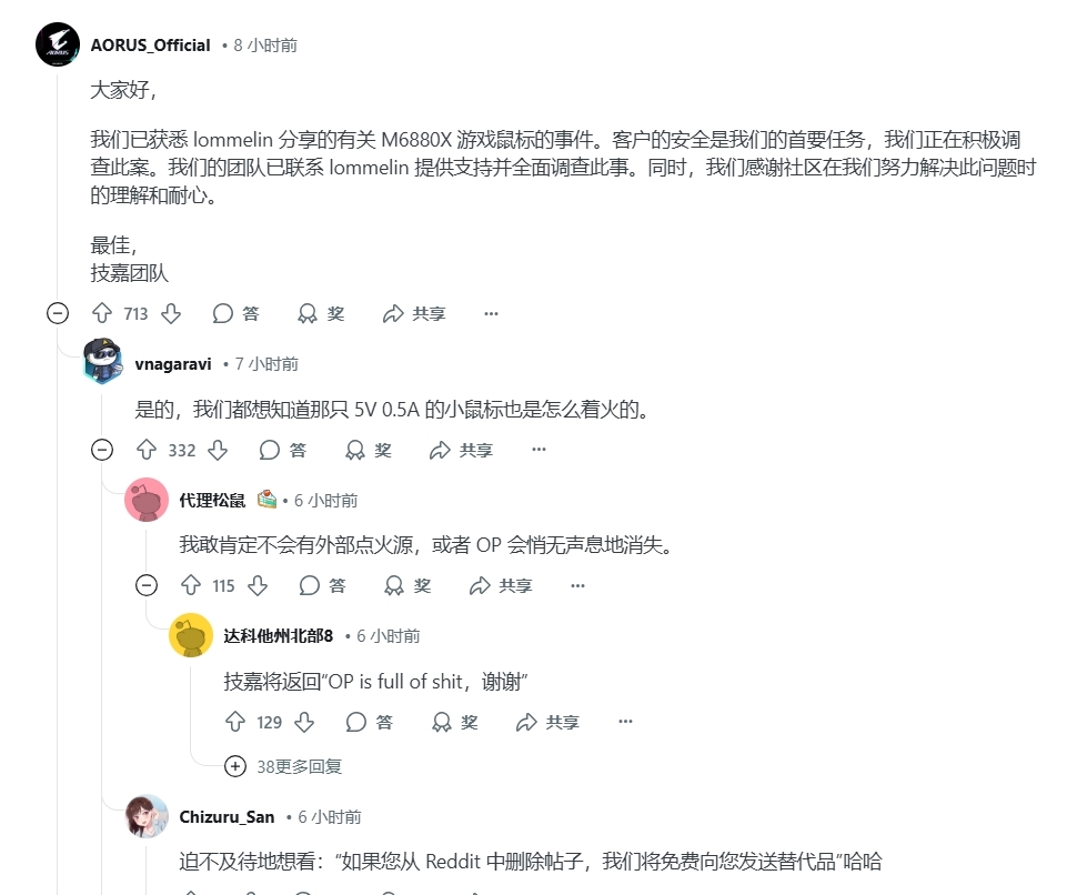 对此,技嘉官方回应称,已获悉lommelin分享的有 M6880X游戏鼠标的事件。客户的安全是我们的首要任务,我们正在积极调查此案。我们的团队已联系lommelin提供支持并全面调查此事。同时,我们感谢社区在我们努力解决此问题时的理解和耐心。