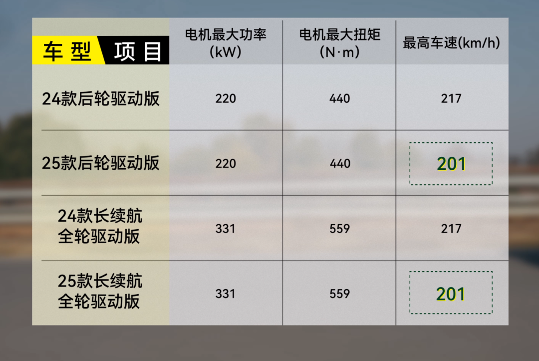 剩下的动力上,焕新 Y 没啥变化,只有最高时速从 217km/h 变成了 201km/h ,应该是给 Performance 性能版留出空间吧。
