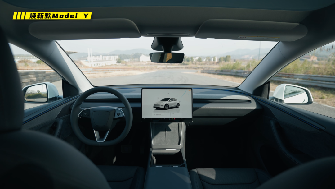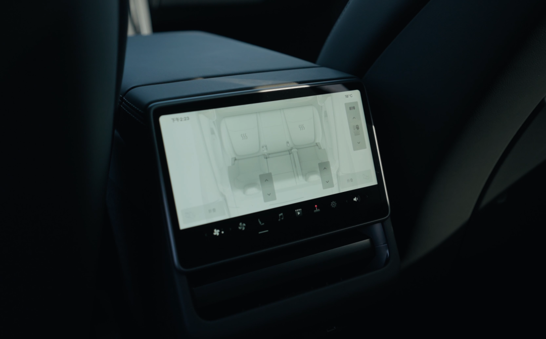 车内整体就是一个加高版的焕新 3 ,设计上其实没有什么值得聊的,改了环抱的氛围灯,大了一丢丢的屏幕,前排座椅多了通风,后排座椅有了加热,还有了个 8 英寸的后排控制屏,这些都和 Model 3 如出一辙。