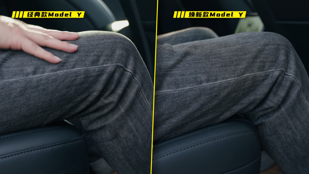 官方数据是,新款后排的坐垫加长了 15mm ,大腿支撑更好,头枕也加宽 17mm 。而且靠背变成了电调,还加了座椅翻折时的防夹功能。