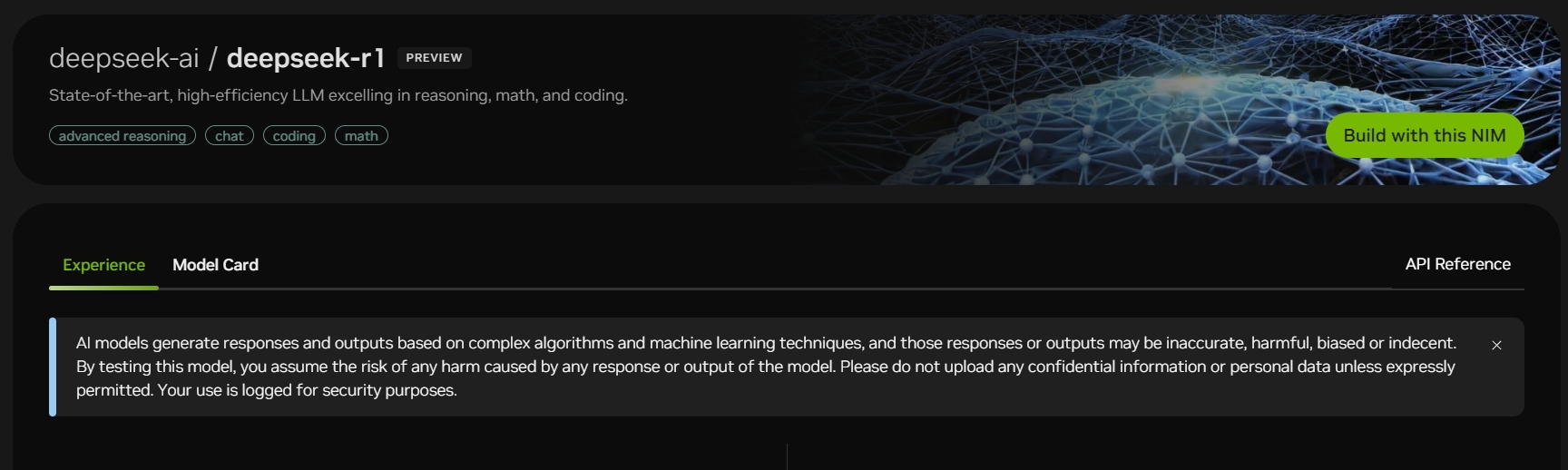 文章写道,为了帮助开发者安全地试验这些功能,并构建自己的专门代理,DeepSeek-R1模型现已作为NVIDIA NIM微服务预览版上线使用。