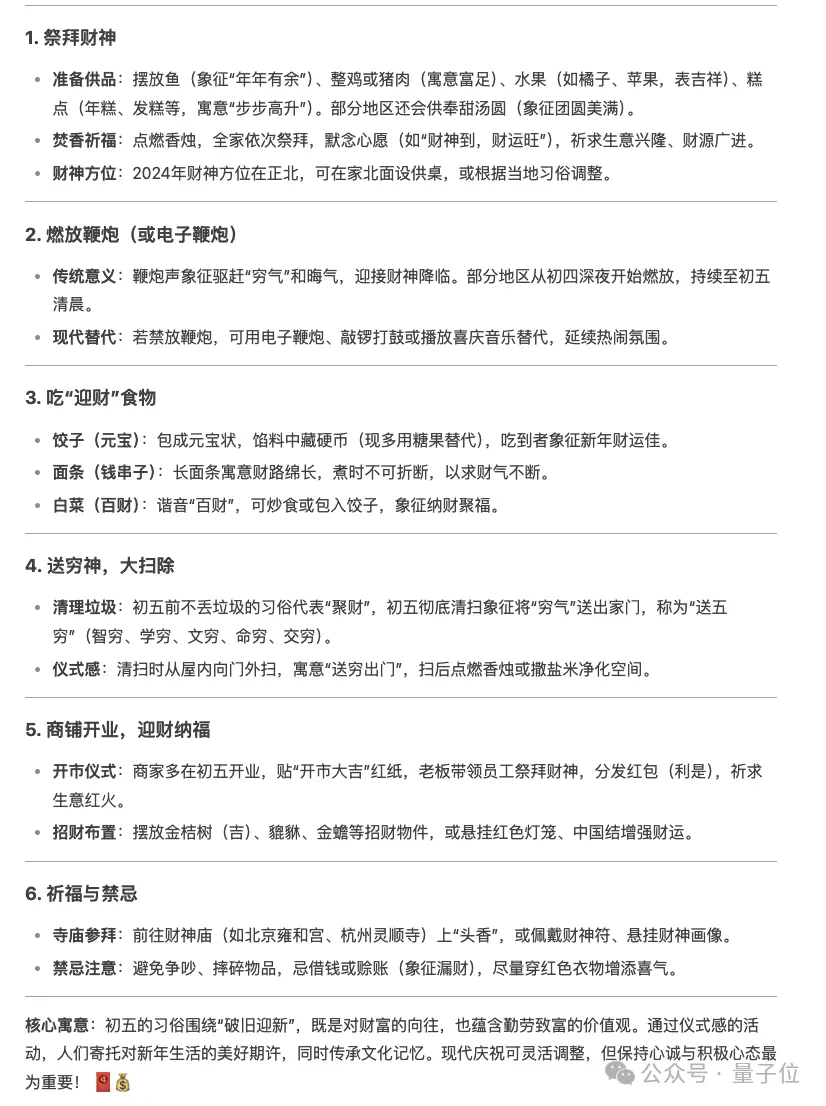 从回答内容上看,V3比较直给,它直接罗列出来,有放鞭炮、打扫卫生、祭拜财神等。