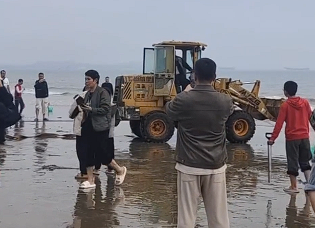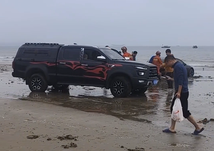 但由于Model 3所陷的位置离海水较近,加上驾驶员也不是专业的救援人员,因此只能远远地牵引,当然,这无济于事。