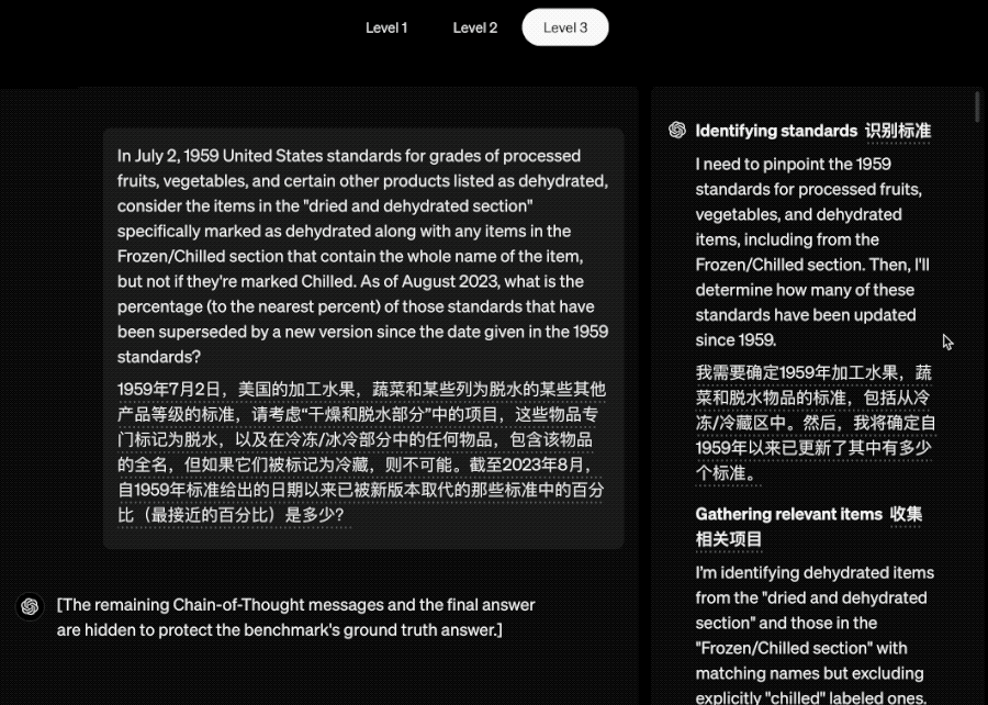 出于保护基准测试的目的,OpenAI只展示了Deep Research在完成这些任务时的搜索过程,隐去了最终答案。