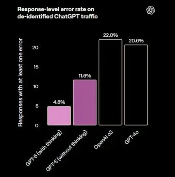 而且,GPT-5 对困扰大伙已久的幻觉问题也出了狠手,它的事实错误率比 GPT-4o 低了 45%,思考时的事实错误率更是比 GPT-4o 低了约 80%。