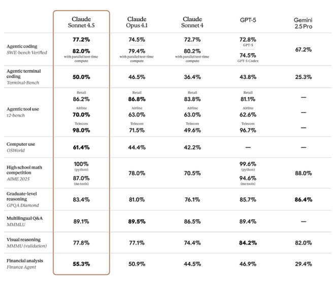 在最新的基准测试中,Claude Sonnet 4.5 展现了全面领先的实力。