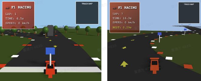 经过几轮微调如控制转弯幅度等,我进一步要求 Claude 参考 F1 赛车的风格,让赛道更复杂。这是一个比较大幅度的修改,而 Claude 不仅增加了弯道,还在指示牌上进行了美化,并且之前修改的内容都没有崩。