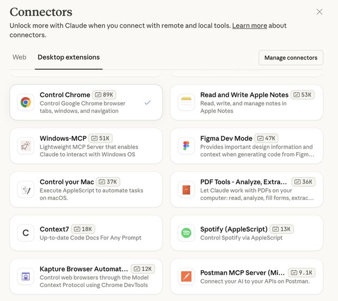 打开桌面端 Claude(Mac),可以看到它有非常多的功能,控制谷歌浏览器、读取记事本、操作Mac、Figma、PDF、Spotify等。