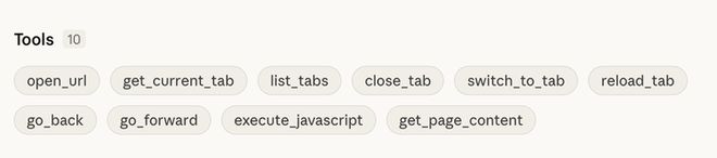 在详情页中可以看到,Claude Sonnet 4.5 为 Chrome 提供了一整套工具:既能打开或关闭网页,也能刷新、后退、前进;还可以执行 JavaScript 代码来完成点击、滑动等操作,并直接提取网页内容。