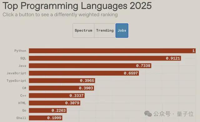 在刚刚出炉的IEEE Spectrum 2025编程语言排行榜上,Python再次斩获最受欢迎的编程语言。不仅是冠军,而且是「一骑绝尘」的断崖式领先——第二名Java和Python的差距相当悬殊。