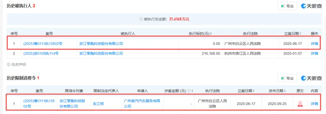 但就在同一天,广州市白云区人民发院也对零跑汽车及其法定代表人朱江明实施了限制消费措施,同时将零跑汽车列为失信被执行人。