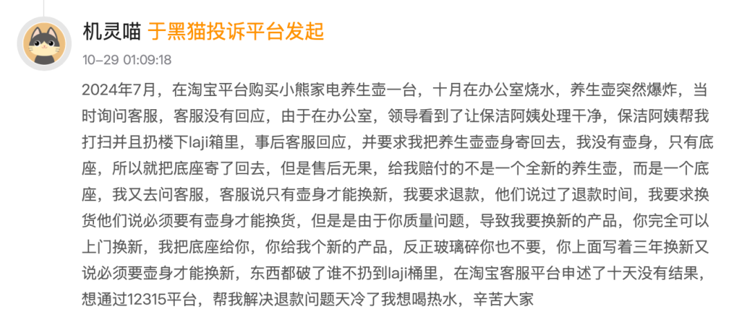 例如,去年10月,有消费者反映,他此前购买的小熊家电养生壶在烧水时突然爆炸。之后,该消费者向客服寻求解决方案,但未能收到满意的答复。