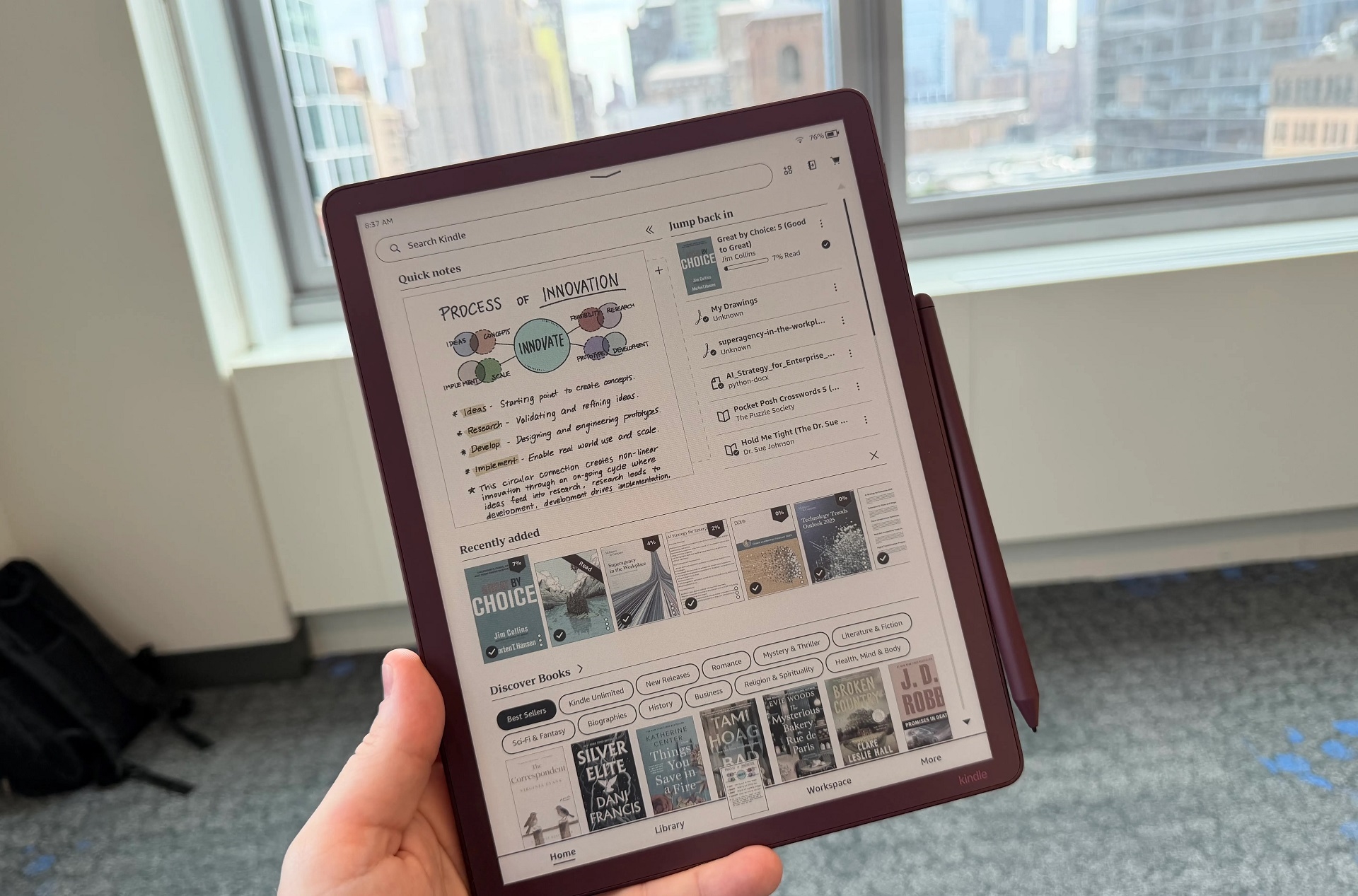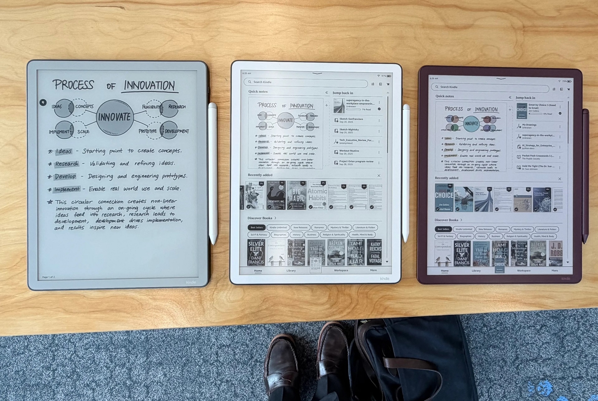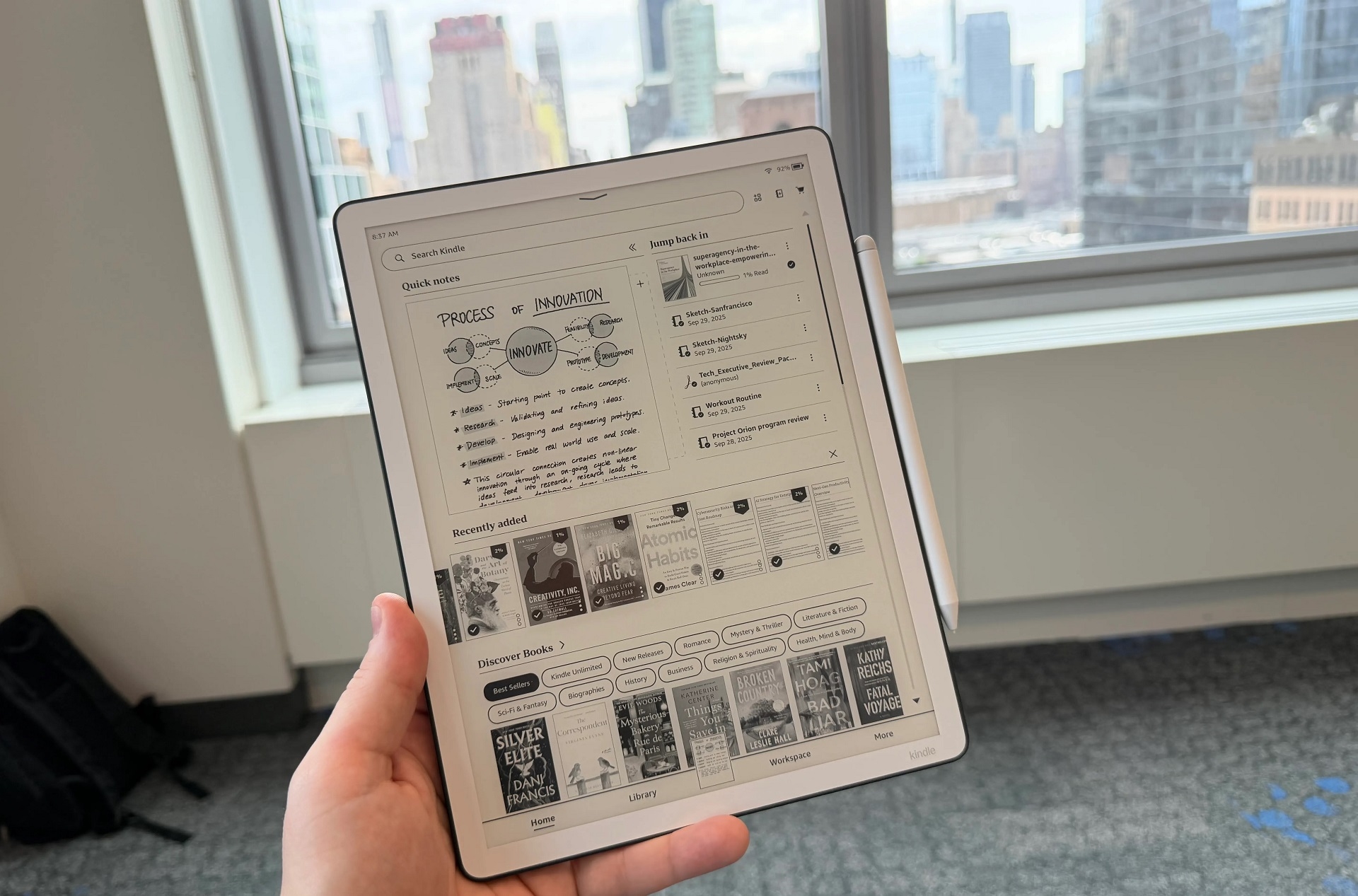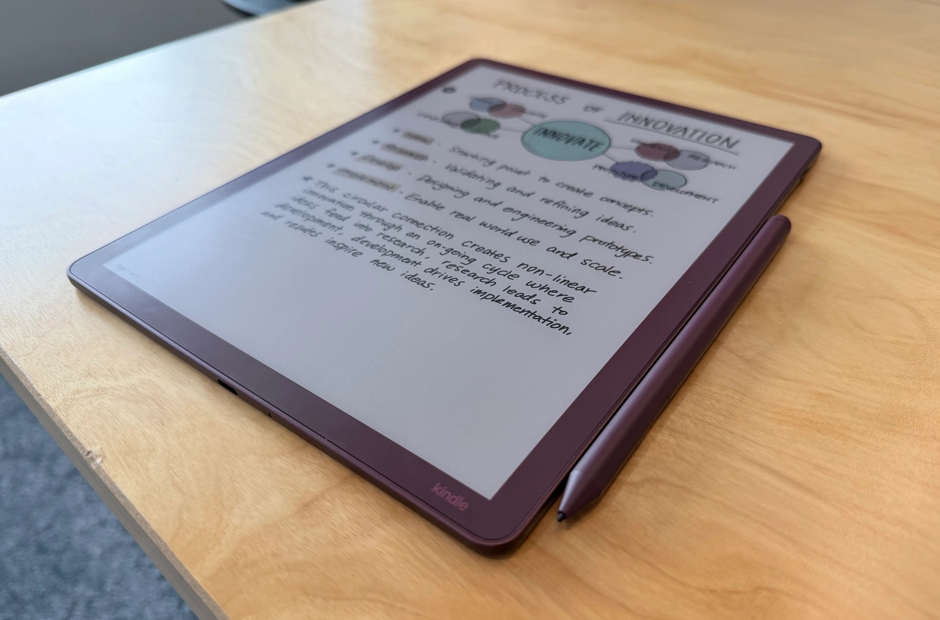 第三代Scribe还配备新款触控笔,尺寸粗了一圈,握持感更好,磁力更强,可牢牢吸附在设备侧。TheVerge的编辑粗略体验了手写感受,感觉比自己的第一代Scribe手写笔流畅许多。亚马逊在宣传材料中声称,为防止笔尖打滑,新款Scribe使用了带蚀刻纹理的屏幕玻璃。