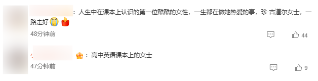 有网友表示:“高中英语教材中的人物,去年还看了她的纪录片。”“书本上的伟大人物。”“第一次认识她是在英语课本上。”“人生中在课本上认识的第一位酷酷的女性,一生都在做她热爱的事。”