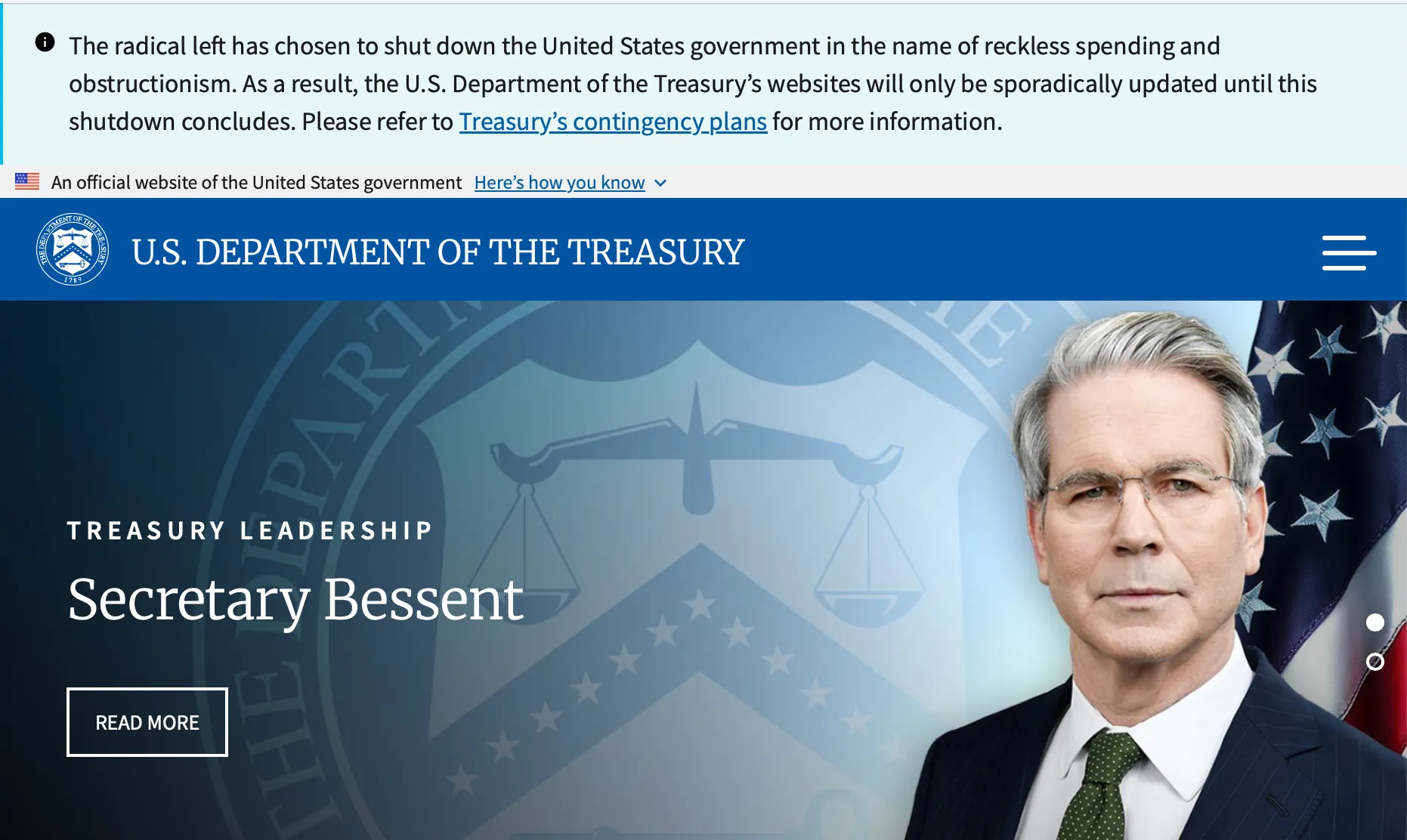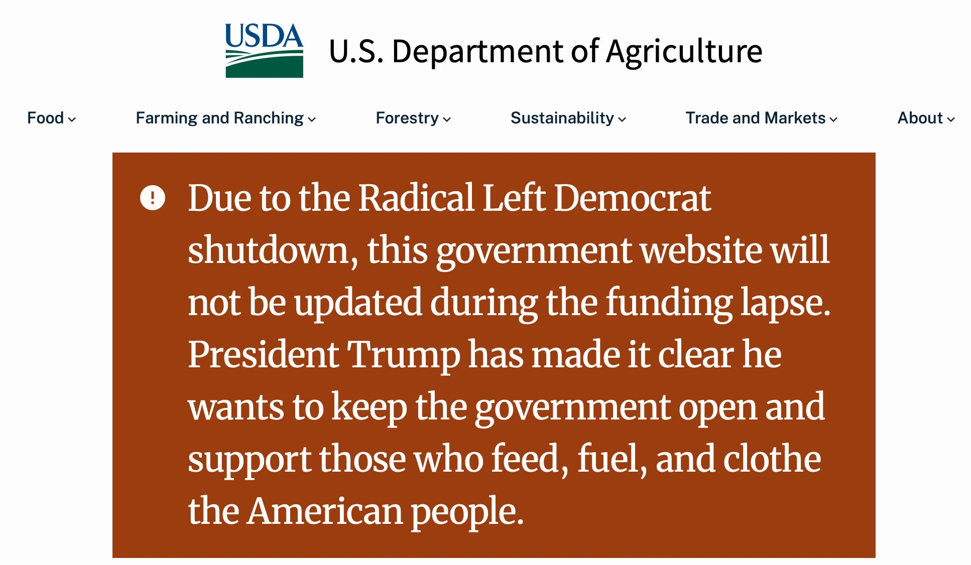 2025年10月2日,联邦政府多个官方网站出现了由特朗普政府发布的新横幅,公开指责民主党造成了政府关门,并在部分页面为总统唐纳德·特朗普进行宣传。例如,美国农业部官网显示的横幅内容为:“激进左翼民主党关闭了政府。特朗普总统明确表示,他希望保持政府运转,并支持所有为美国人民提供粮食、能源与服装的人。”