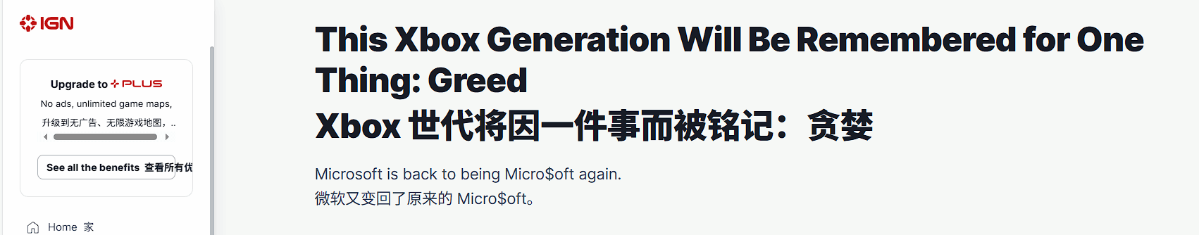 今日,IGN撰文讨论了这一情况,并在标题中批评称:“这一代的Xbox将因为贪婪而被世人铭记,Microsoft又变回了Micro$oft。”