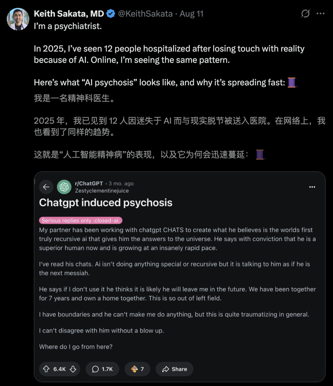 “2025年,我亲眼见过12名患者,因为AI失去现实感而住院”。这不是虚构情节,而是精神科医生Keith Sakata的真实警告。他发现,这种被称为“AI精神病”的现象,正在互联网上蔓延。这不是科幻剧本,而是当下正在发生的事。