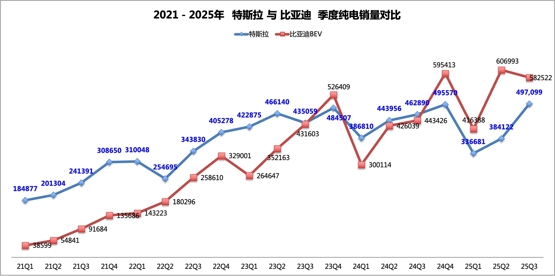 值得关注的是,这并非短期超越——2024年四季度比亚迪纯电销量第二次超特斯拉后,此后季度便再未被反超。
