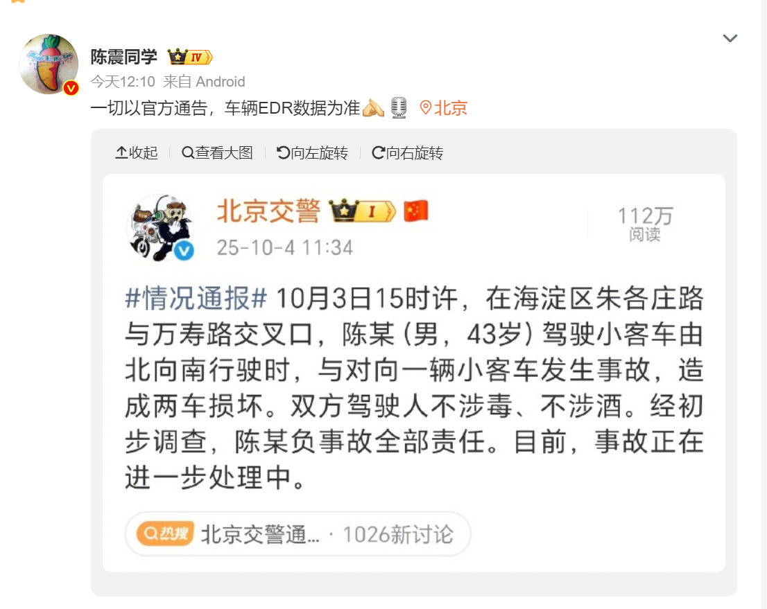劳斯莱斯撞车负全责 陈震回应:一切以官方通告 车辆EDR数据为准