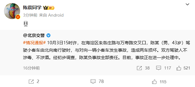 北京交警针对昨日发生的一起备受关注的交通事故进行通报:10月3日15时许,在海淀区朱各庄路与万寿路交叉口,陈某(男,43岁)驾驶小客车由北向南行驶时,与对向一辆小客车发生事故,造成两车损坏
