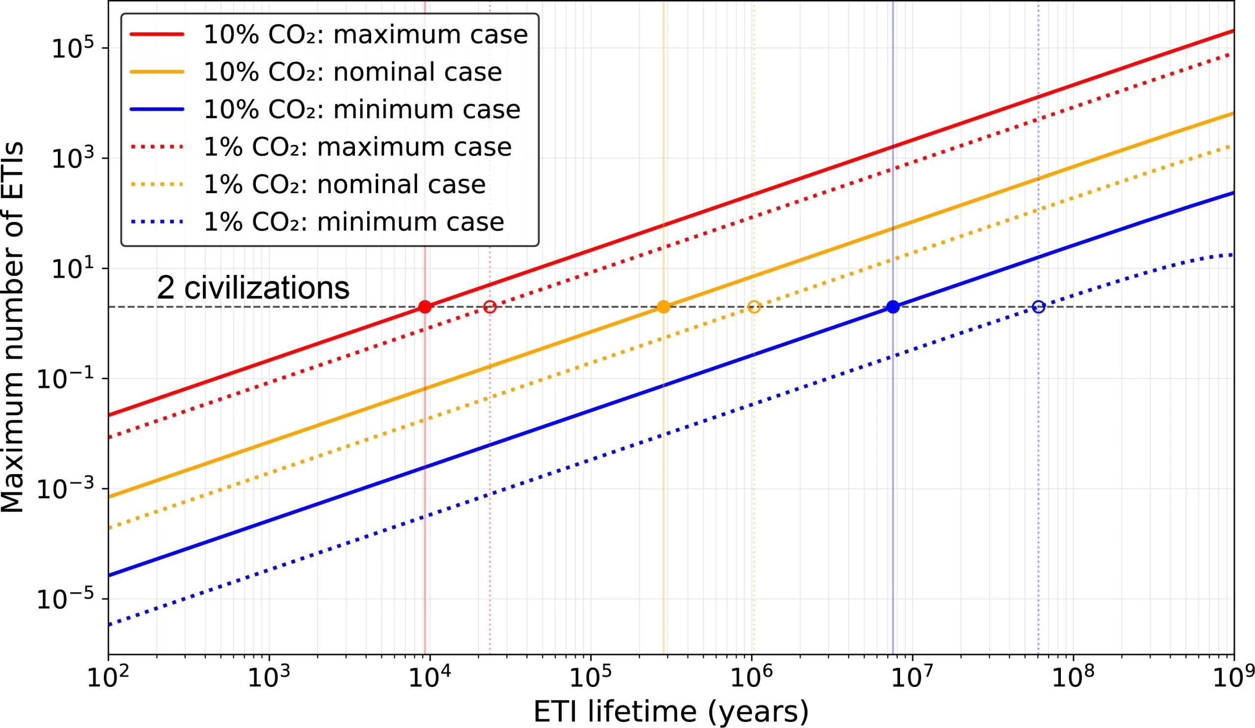 综合所有这些因素,舍尔夫和拉默得出结论:生活在二氧化碳含量为10%的行星上的技术物种,必须至少存续280,000年,才能在我们所处的时代有另一个文明同时存在于银河系中。