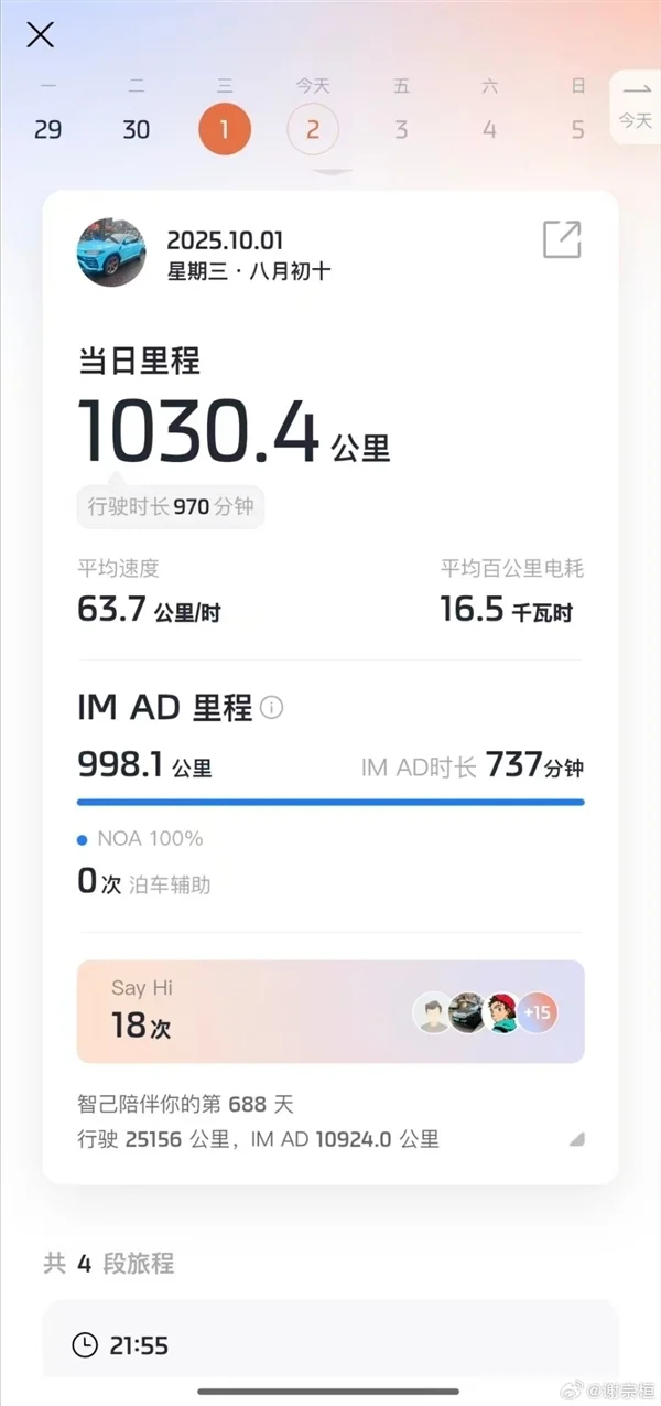 并且,司机还炫耀车辆的自动驾驶里程,10月1日当天他行驶了1030.4公里,其中,使用IM AD辅助驾驶驾驶了998.1,用时737分钟,在支持NOA辅助驾驶的路段,NOA使用率达到了100%,几乎相当于全程是车辆在开。