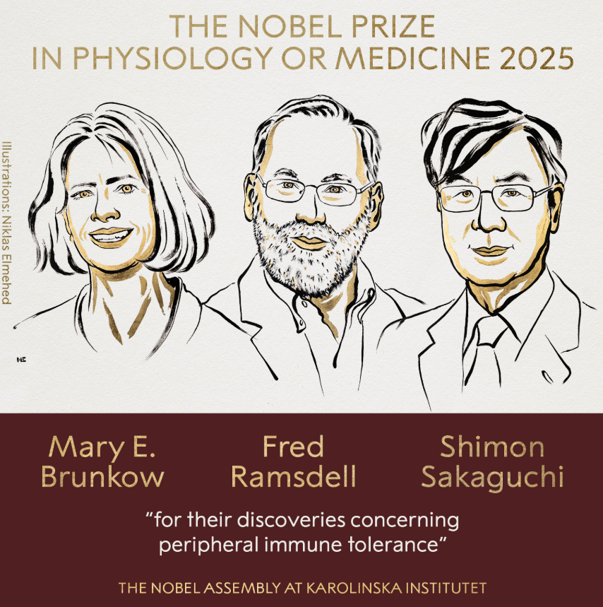 当地时间10月6日,瑞典卡罗琳医学院宣布,将2025年诺贝尔生理学或医学奖授予科学家玛丽·布伦科(Mary E. Brunkow)、弗雷德·拉姆斯德尔(Fred Ramsdell)和坂口西蒙(Shimon Sakaguchi)。