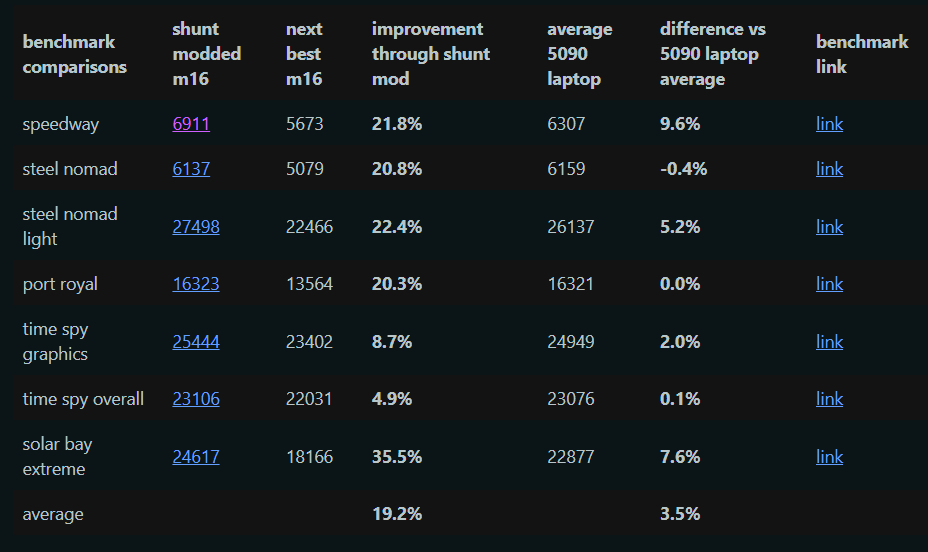 该用户对其Zephyrus M16 GU604VY游戏笔记本中GPU进行了改装,在现有的5毫欧姆电阻上叠加了一个1毫欧姆电阻,将总电阻降至约0.83毫欧姆。