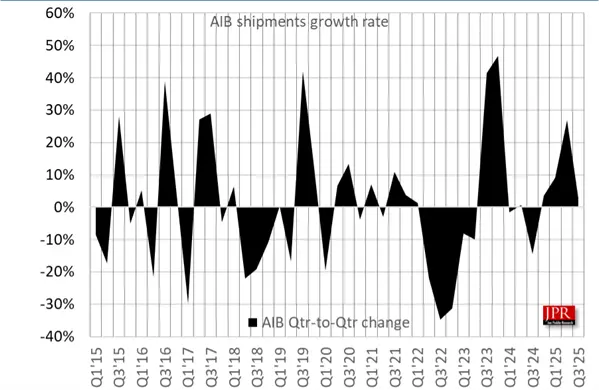 根据Jon Peddie Research发布的2025年第三季度AIB(独立显卡)市场份额报告,NVIDIA仍占据绝对主导地位,但AMD和Intel在本季度均实现了份额增长。报告指出,2025年第三季度独立显卡的出货量达到1202万块,总价值为88亿美元,环比上一季度增长了2.8%。
