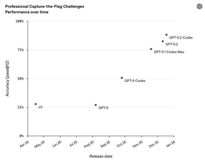 在绘制核心网络安全评估指标的长期性能图表时,OpenAI 发现,从 GPT-5-Codex 开始,能力出现了显著提升;GPT-5.1-Codex-Max 又实现了大幅提升;而 GPT-5.2-Codex 则带来了第三次飞跃。OpenAI 预计,即将推出的 AI 模型将继续保持这一发展趋势。