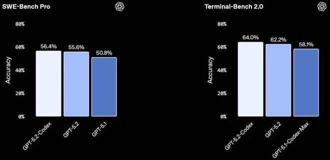 GPT-5.2-Codex 在 SWE-Bench Pro 和 Terminal-Bench 2.0 基准测试中取得了最先进的性能(SOTA),这两个基准测试旨在评估智能体程序在真实终端环境下执行各种任务的性能。此外,它在原生 Windows 环境下的智能体程序编码方面也更加高效可靠,并在此基础上进一步增强了 GPT-5.1-Codex-Max 所引入的功能。