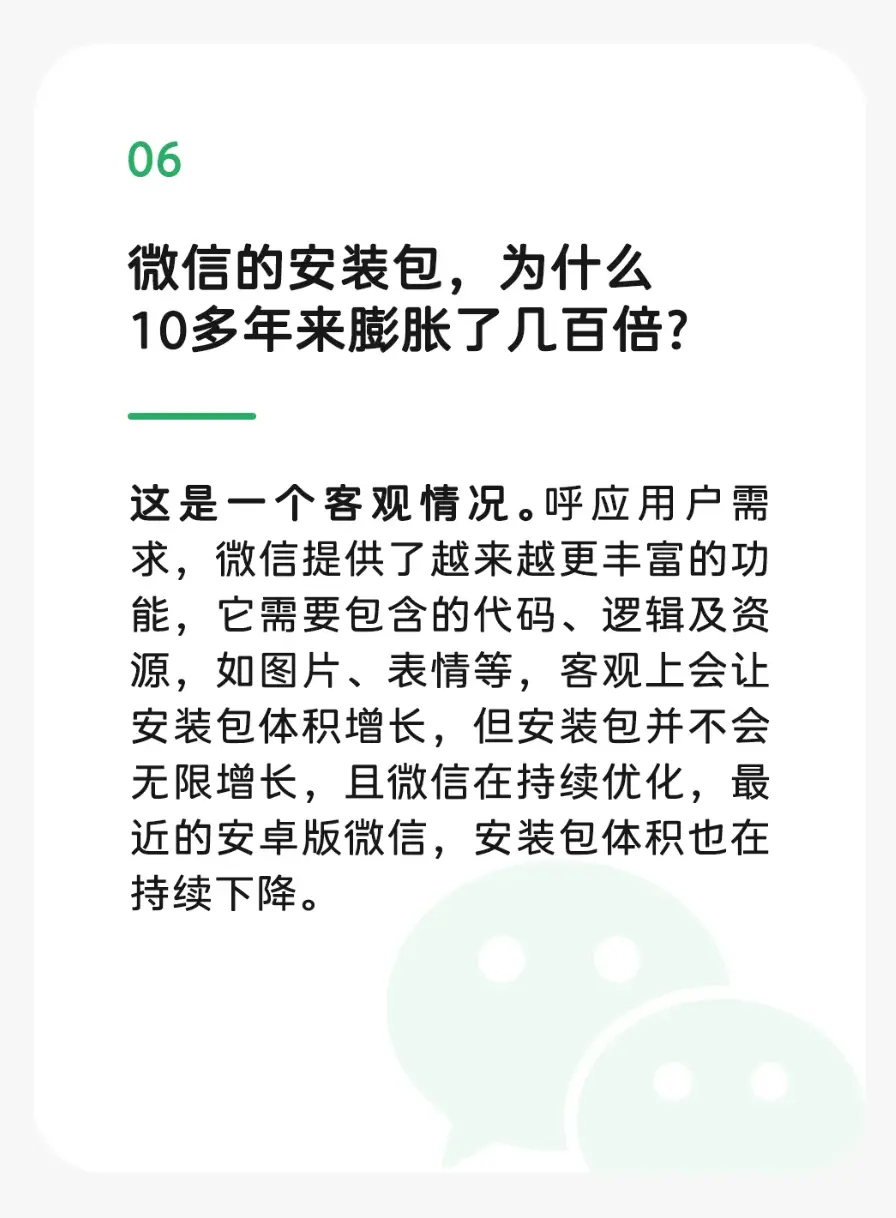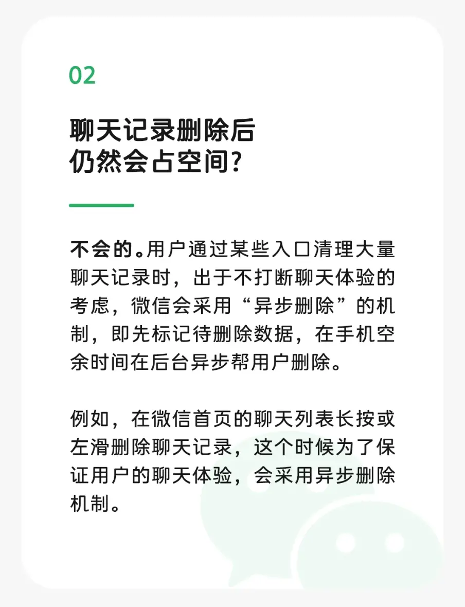 聊天记录删除后仍然会占空间?官方称,不会。用户通过某些入口清理大量聊天记录时,出于不打断聊天体验的考虑,微信会采用“异步删除”的机制,即先标记待删除数据,在手机空余时间在后台异步帮用户删除。例如,在微信首页的聊天列表长按或左滑删除聊天记录,这个时候为了保证用户的聊天体验,会采用异步删除机制。