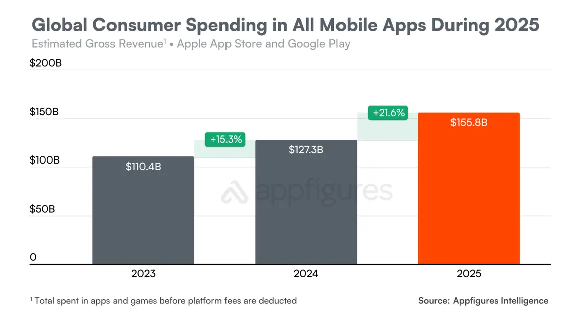 Appfigures的报告显示,2025年,苹果App Store和GoogleGoogle Play上的移动应用和移动游戏全球下载量预计达到1069亿次,同比下降2.7%。与此同时,消费者支出增长21.6%,预计达到1558亿美元。