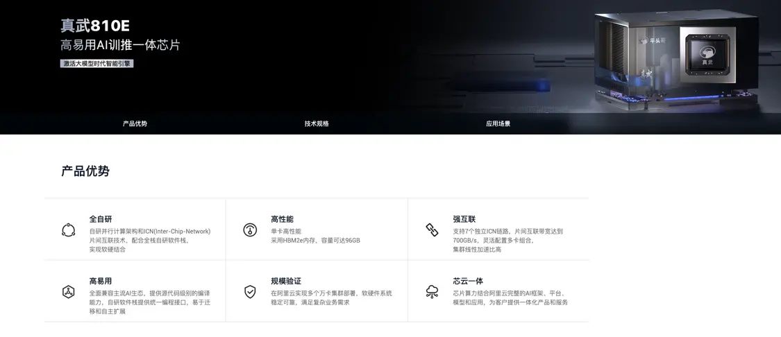 据平头哥官网介绍,“真武”PPU采用自研并行计算架构和片间互联技术,配合全栈自研软件栈,实现软硬件全自研。其内存为96G HBM2e,片间互联带宽达到700 GB/s,可应用于AI训练、AI推理和自动驾驶。阿里巴巴已将“真武”PPU大规模用于千问大模型的训练和推理,并结合阿里云完整的AI软件栈进行深度优化,为客户提供一体化产品和服务。