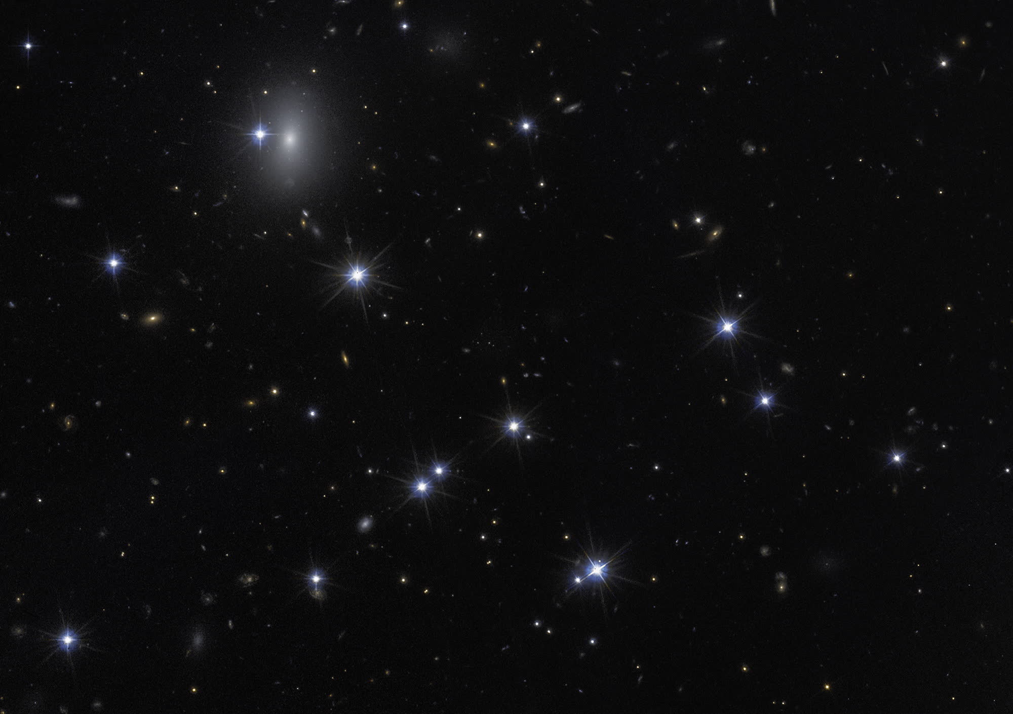 借助哈勃的高分辨率成像能力,研究团队在距离地球约 3 亿光年的英仙座星系团方向,识别出了四个独立的球状星团。 随后结合欧几里得和昴星团望远镜的补充观测,科研人员在这些星团周围检测到一圈极为微弱的弥散光辉。 分析显示,这些稀薄的光线源自一座邻近星系,而该星系本身的恒星光极度黯淡,几乎隐没在宇宙背景之中。