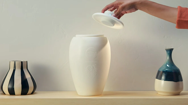 据介绍,这款音箱尺寸为7英寸*11.4英寸(约17.8cm*29cm),极简主义设计,纯白配色,带有双方品牌标识,盖子内置隐蔽式蓝牙发声单元,可连接任何蓝牙设备播放音乐,具备基础容器功能,但官方不建议用于盛放真实骨灰。