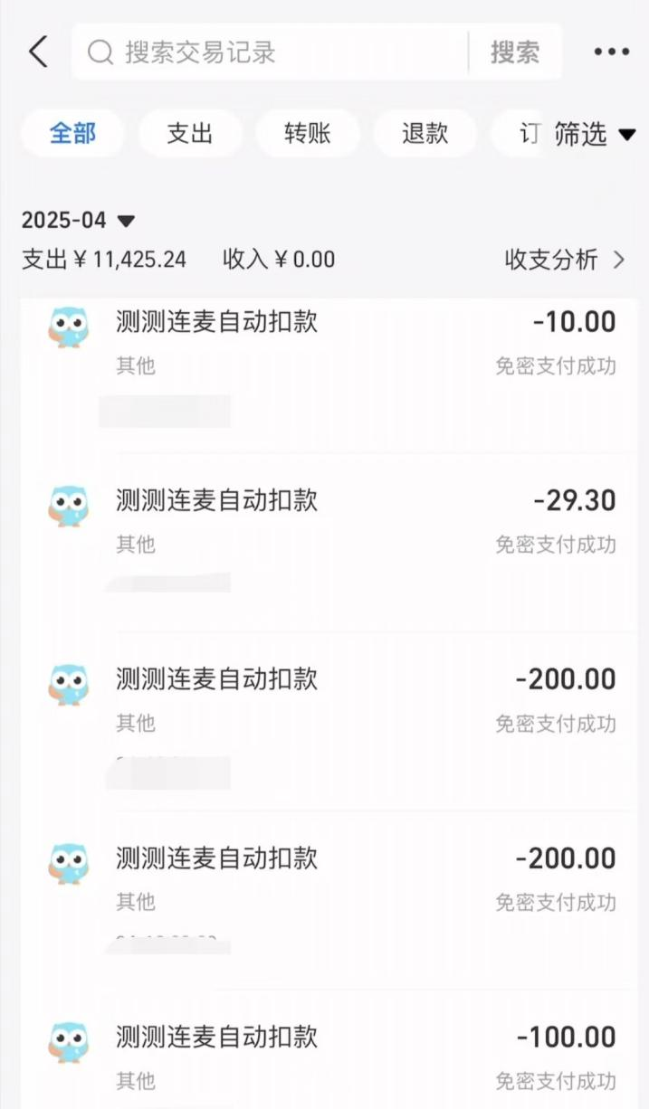 在她向《BUG》栏目提供的付费记录中,仅2025年4月,她在测测App与平台达人进行付费连麦的支出就已超过 1 万元。