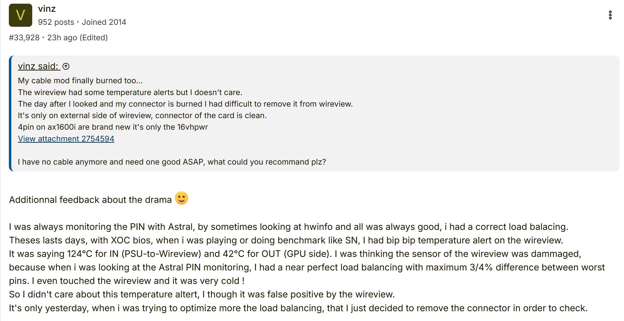 由于显卡本身的针脚监测数据显示正常,电源线负载几乎完美平衡,WireView摸上去也不烫,他就认为是误报,没有搭理。