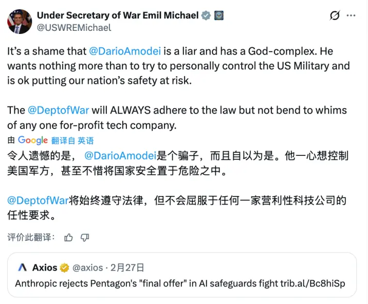 DoW的部长直接就在X上称Anthropic创始人阿莫迪是“骗子”“而且还自以为是”。特朗普也亲自下场,说Anthropic是“激进左翼觉醒公司”“根本不懂现实世界”。