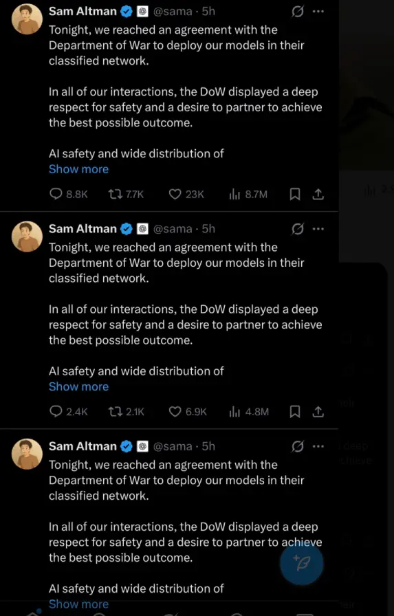 奥特曼突然在X上宣布:OpenAI和DoW,也达成合作了。