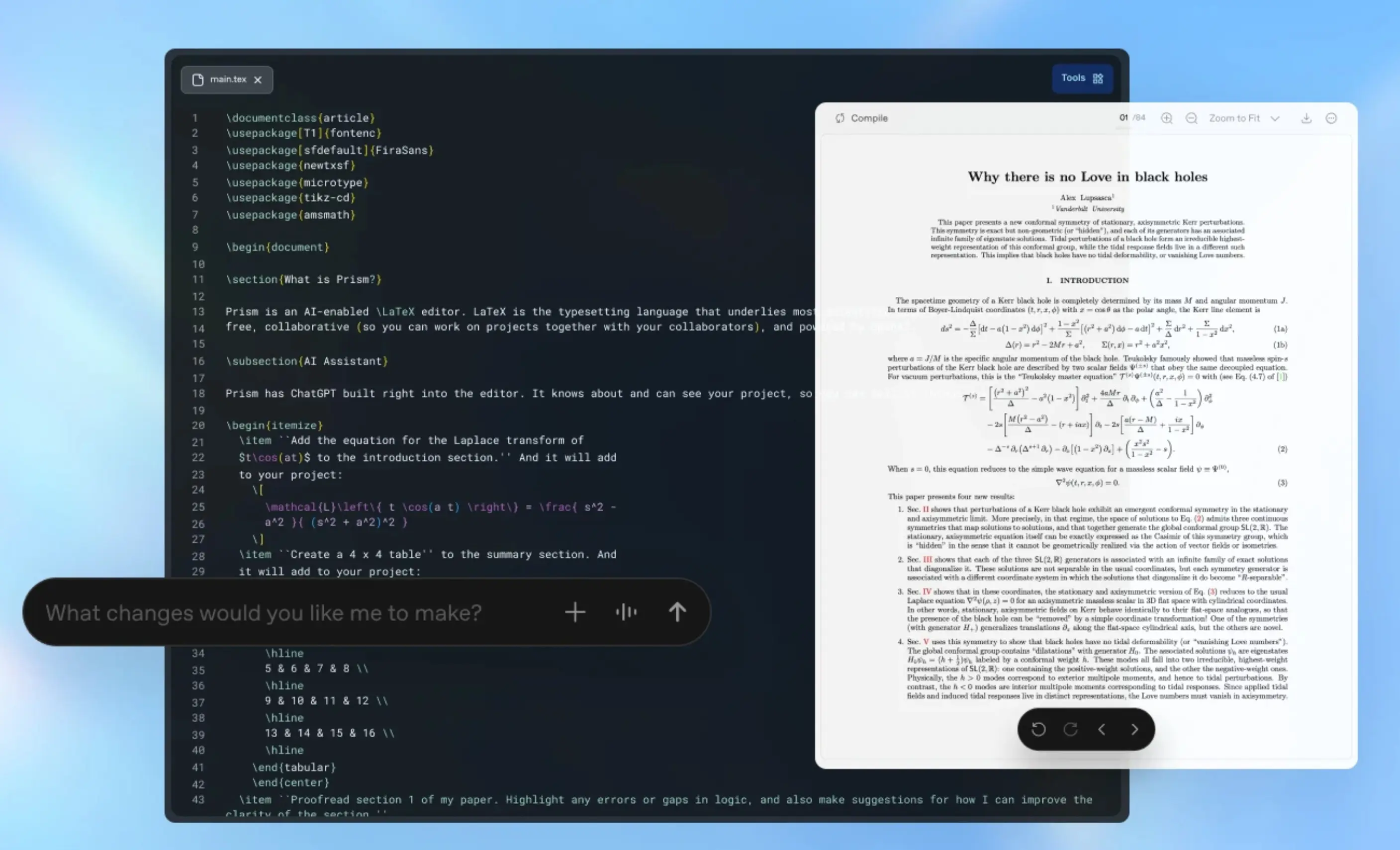 Prism 最初于今年 1 月发布,定位为一体化的科学写作与协作平台,旨在让研究人员不必在文本编辑器、PDF 阅读器、LaTeX 编译器、文献管理工具和聊天界面之间频繁切换。 通过 Prism,用户可以在同一环境中完成 LaTeX 编辑、插入引用、管理和生成图表,并开展实时协作,从而将科研写作的关键环节统一到一个工作空间中。
