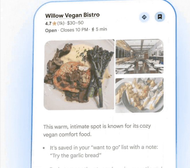 为了提供个性化回复,Gemini会调用用户之前在Google地图或Google搜索中的搜索记录,也包括Google地图中保存的位置、收藏夹或添加到列表中的地点。