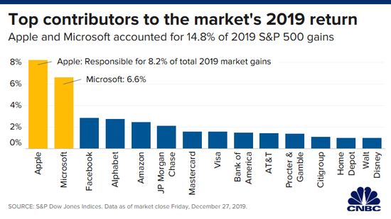 2019年将成为标普500指数历史性的一年,这其中两只股票贡献最大。根据标准普尔道琼斯指数,苹果和微软今年的涨幅分别为85%和55%,两者合计贡献了标普500指数2019年涨幅的近15%。今年它们对这一资本加权指数的影响超过了仅次于它们的8个最大贡献者的总和。截至周一,标准普尔500指数今年涨幅为28%。