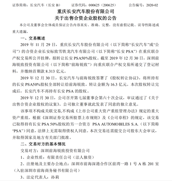 该公告显示,2019年12月30日,长安汽车与前海锐致签署了《股权转让协议》,将所持有的长安PSA 50%股权全部转让给前海锐致,转让金额为16.3亿元。本次股权转让完成后,长安汽车不再持有长安PSA 的股权,长安完全退出合资公司。