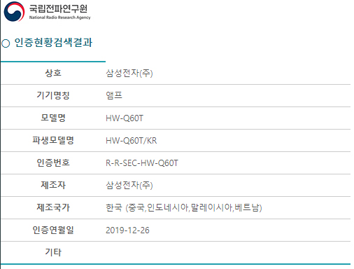 此外新款 HW-Q60T(2019 年发布的 HW-Q60R 的继任者),也已经通过了韩国监管机构 RRA 的认证。