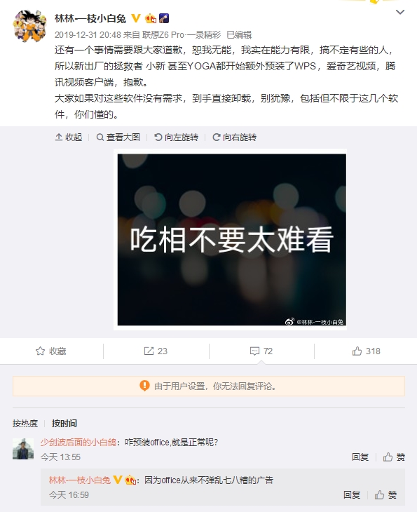 昨日晚间,就在大家喜迎新年之际,认证为“联想集团平板电脑事业部高级产品经理”的微博用户@林林-一枝小白兔 发帖向大家道歉,称自己无能,实在能力有限,搞不定有些人,新出厂的联想拯救者、小新,甚至YOGA系列笔记本都开始额外预装WPS、爱奇艺视频、腾讯视频客户端这三款软件。