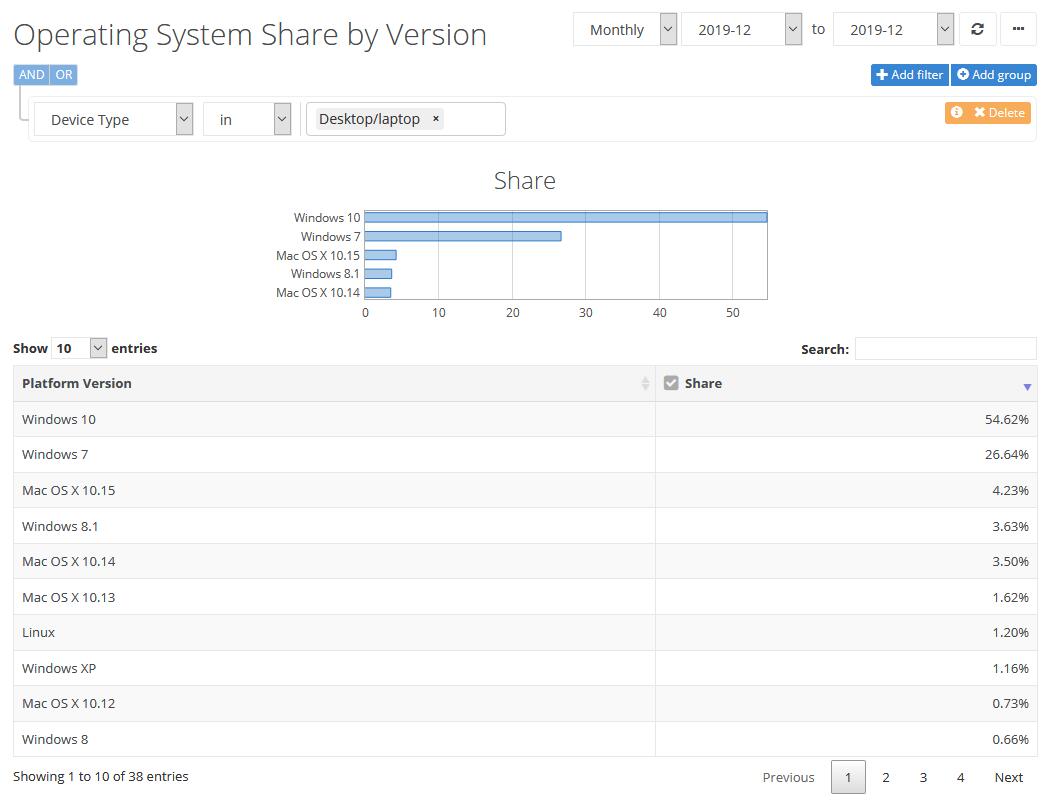 根据市场调查机构Netmarketshare近日发布的2019年12月报告显示,Windows 10系统的市场份额略有上升,但Chrome的市场份额略有下降。伴随着Windows 7停止支持已经进入最后的倒计时阶段,越来越多的用户正切换至Windows 10系统,目前市场份额占比达到54.62%,而Windows 7位居第二,为26.64%。